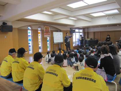 年長児が五条警察署のおまわりさんから交通安全指導を受けました。地域の見守り隊交通安全協議会の方も来てくださいました。実地指導では一人で道を歩く稽古です。横断歩道や信号のないところも立ち止まって左右を良く見て手を挙げて渡ります。保護者の方が後ろから見守り付いて歩いてくださいました。園外保育に出かける機会の多い年長児、大勢では列に並んで上手に歩くことが出来ます。春からは一年生、自立に向かってがんばりましょう。地域の方々もいつもみんなで応援してくださいます。ありがとうございました。これからもよろしゅうおたのもうします。