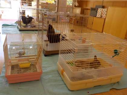 ウサギのカリカリちゃん,ピンコちゃんやウコッケイのオンプちゃん,スキップちゃん,ココアちゃん,インコのリボンちゃんなど幼稚園で大事に世話をしている生き物たち。いつもは子どもたちが率先してエサをあげてくれたり,飼育ケースを掃除してくれたりしますが,夏休みの間は先生たちがお世話をしています。ザリガニやカタツムリ,カブトムシも,みんなに会えるのを楽しみに,幼稚園で元気に過ごしています。