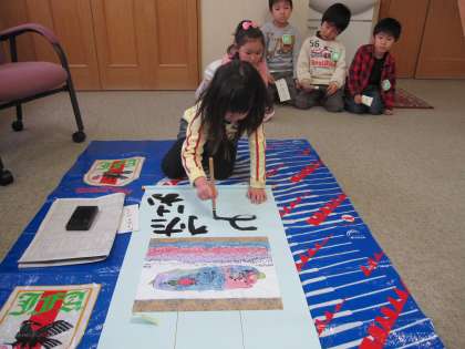 昨日、年長児の掛け軸全員分が完成しました。仕上げにそれぞれ自分の名前をかきます。書道?です。硯と筆を用意して、ぶっつけ本番、どの子どもも真剣です。仕上がりはどれも味のある芸術的なその子どもならではの文字です。もうすぐ卒園茶会です。子ども達の掛け軸を飾ります。