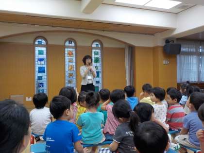 夏休みもついに終わり,今日は,2学期始業式でした。久しぶりにみんなが登園して,遊戯室に集まりました。園長先生から「みんな,夏休みの間に心もからだも大きくなってるね」と言ってもらって,とてもうれしそうに胸を張っていた子どもたちの姿が印象的でした。夏休みに経験したことを担任の先生や友達に「あのね,ぼくね。○○したんだよ。それでね・・・」と話したいことがいっぱいの子どもたち。まだまだ話し足りないよね。明日も楽しい思い出を聞かせてくださいね。