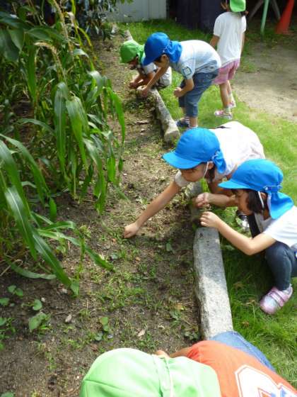 2学期が始って2日目。5歳児の子どもたちは,幼稚園の畑「ほしファーム」に,自分たちが植えたサツマイモとポップコーンのお世話に行きました。夏休みの間は,様子を見られなかったので,どうなっているのか楽しみに幼稚園から元気に歩いていきました。