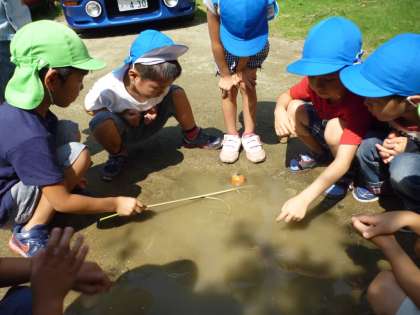 昨日の雨のおかげて,大きな水たまりができていて,そこに柿の実が落ちていました。その柿の実を子どもたちが見つめながら何やら相談しています。よく見ると,柿の実の上には小さなありさんが・・・どうやって助けてあげるのかをみんなで話していたようです。植物にも虫にも心を動かした1日でした。