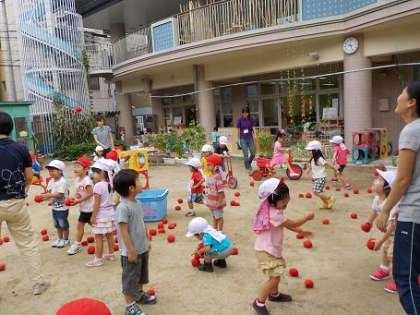 そのあとは,玉入れの赤玉を園庭に出し,玉遊びをしました。「みてみて!」と高く投げてみたり,かごをめがけてシュートをしたり,友達や先生と投げ合いっこをしたりしてとっても楽しみました。投げるだけではなく,手の上を転がしたり頭の上に乗せたりしながらいろいろな遊び方を知っていって欲しいと思います。
