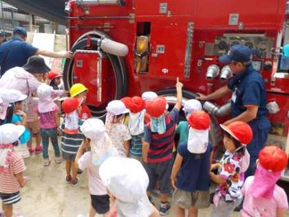 そして,消防車を見て大興奮の子どもたち。ホースを見つけて触ったり,運転席を見て,様々な装置のことを消防士さんに教えてもらったりしました。