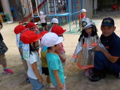 その後,先生たちが消火器で消火訓練するのを見ました。子どもたちも消防士さんの着ている火のうつりにくい服を実際に着させてもらいました。