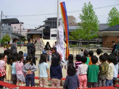 4月24日(金)幼稚園の前の竹間公園で京人形商工業協同組合からこどもみらい館に寄付された鯉のぼりの寄付受納・掲揚セレモニーがありました。年長児60名が参加し、4月生まれの子どもたちが代表で鯉のぼりを揚げました。守口組合理事長や浅野こどもみらい館長の話を聞いたり、「こいのぼり」のうたを歌いました。青空が澄んで鯉がきれいでした。登降園のときには、いつも見ることができます。ありがとうございました。
