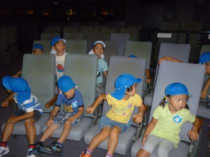 科学センターには,大きなプラネタリウムがあります。この日は,他の幼稚園のお友達と一緒に貸切で,プラネタリウムの天井で星座が出てくるお話の読み聞かせを見たり,ロケットに乗って宇宙旅行気分を味わったりと,楽しくもどきどきする経験もしました。天空が動くと,「ぼくのいす,動いてるよね」と体が浮いたような感覚になるようで,その感覚を楽しんでいるようでした。