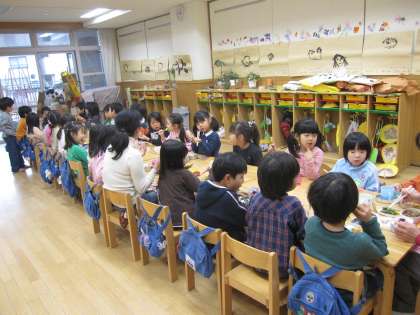 あいにくの雨でマラソン大会が中止になってしまいました。年長児たちのお弁当の時間を覗いてみました。近くの友達と話しながら時には笑いながらとても楽しそうです。残りわずかになった幼稚園生活を友達と味わいながら過ごす様子に嬉しい温かさを感じます。どの子どもにとっても居心地よい空間が仲間や先生のいる幼稚園であることは本当に嬉しいことです。後何回お弁当を食べるのでしょうね。いつも愛情いっぱいのお弁当ありがとうございます。18日はいよいよ修了式です。もうすぐですね。
