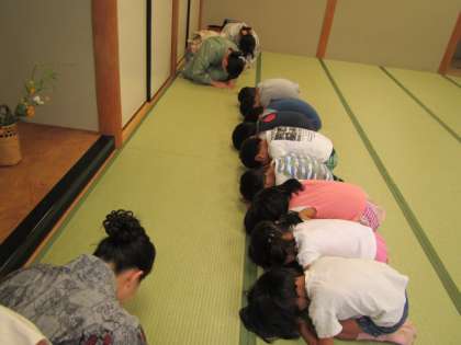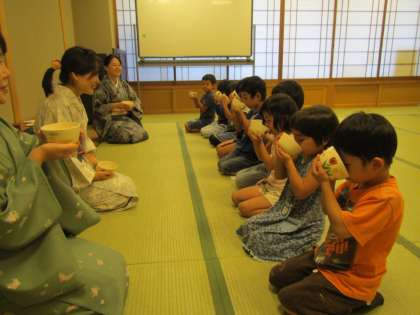 初めてのお茶会に,どきどきしながら和室へ入っていく子どもたち。笑顔で迎えてくださったお茶の先生方にほっとして,おけいこが始まりました。