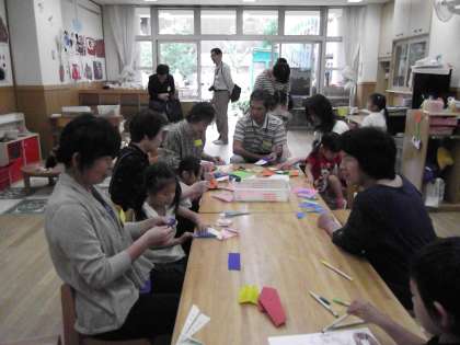 園庭や保育室でも,いつもしている好きな遊びを一緒にしたり,折り紙やお手玉などでおじいちゃんおばあちゃんの得意なことを見せていただいたり,楽しい時間を過ごしました。折り紙の得意なおばあちゃんはたくさん駒を作って下さったりと,みんなのおじいちゃんおばあちゃんとして関わって下さっていて,子どもたちもとても嬉しそうでした。