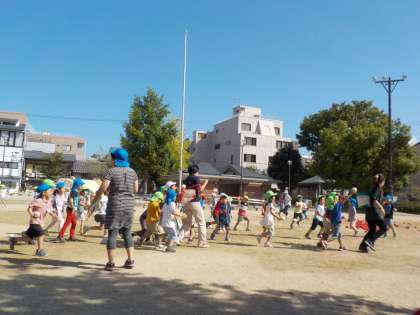 そして今日はそのまま,全学年で玉で遊びました。以前はゴール杯を出して玉入れを楽しみましたが,今日は先生たちが背負っているカゴに玉を入れる,追いかけ玉入れを楽しみました。逃げる先生を一生懸命追いかけて,カゴを目掛けて玉入れをしました。「待て待て〜」「入った〜!」と楽しい声が聞こえてきて,応援している子どもたちも「がんばれ〜!」と声を掛けていました。