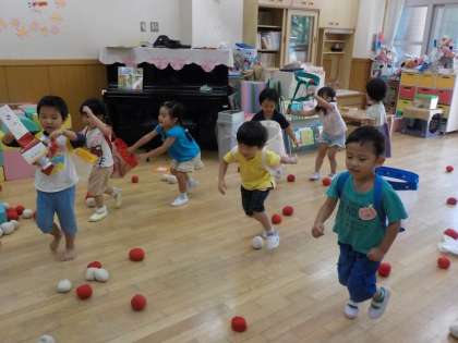 保育室に戻ってからは,今度は自分たちでカゴを背負って玉入れを楽しみました。楽しかったことを続けて同じように遊ぶ姿が印象的でした。