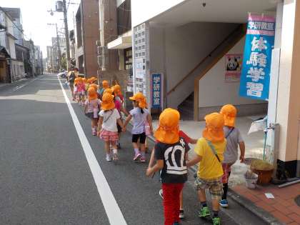 この間行った京都御苑とは違い中学校までは長い道のりですが,横断歩道で手をあげて忍者のようにササッと渡ったり,お互いに声を掛けあったりしながら行きました。中学校に着くとお兄さんやお姉さん達が運動会の真っ最中。