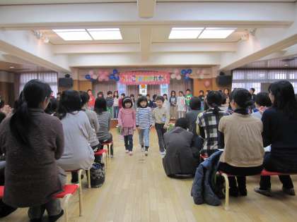 親子お別れ会がありました。卒園対策委員の保護者の方々が幼稚園と一緒に準備してくださいました。子ども達が歌ったり、保護者の方の歌をきいたり、先生達も劇をしたり歌を歌ったりしました。幼稚園に因んだクイズ大会では屋上まで階段が51段あることも確認させてもらいました。遊戯室でみんなでお弁当タイム。園長室では託児があり年長児が保護者を独り占めして甘えていました。幼稚園の時期ならではだなあと思う可愛い光景があちらこちらに見受けられました。私は皆さん方の笑顔がいっぱいの場面で涙ぐみそうになりました。幼稚園の主役、子ども達、先生、保護者の方々が輝いている様子を見てとても嬉しかったです。後数日で修了を迎える皆さん、大きくなった子ども達、素敵な保護者の方々、思い出のひとときをありがとうございました。もらった金メダルを大事にしたいと思います。