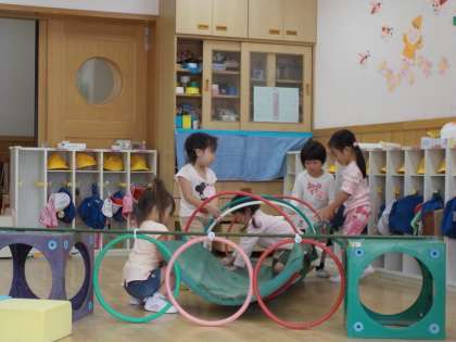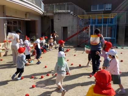 運動会に参加し,4,5歳児や保護者の方が一生懸命走ったり,取り組んだりする様子を見て,3歳児も同じようにやってみたいという気持ちが出てきたようです。4歳児が楽しんでいたフープを借りに行って,一緒に遊ぶ姿もありました。また,先生たちと一緒に追いかけ玉入れも楽しみました。