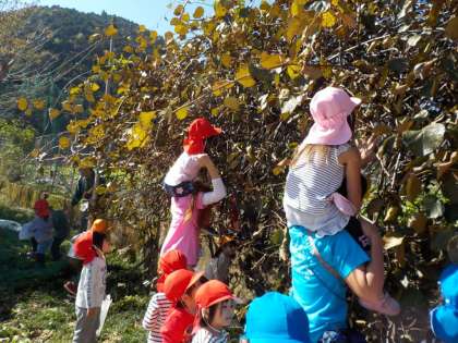 キウイもたくさん実っていて,みんなで収穫しました。高いところは先生に肩車をしてもらいながら楽しく収穫しました。収穫したキウイはおいしくなるまで園で保管し,また後日のお楽しみです。