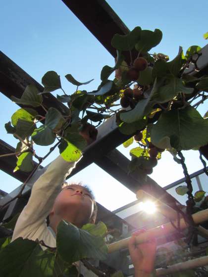 先日,大原学舎でキウイをたくさん収穫させてもらいました。そして今日は,幼稚園の砂場の上になっているキウイを収穫しました。