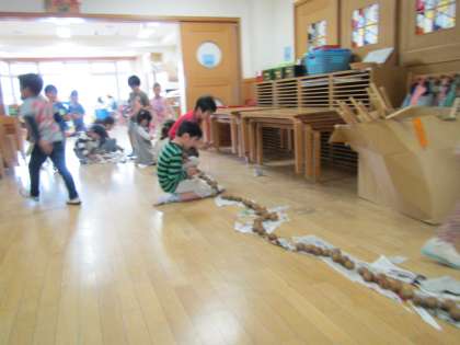 そして,大原学舎と幼稚園のキウイを全部数えてみました。遊戯室から出発したキウイの列は,ホールを越えて,すみれ組まで届きました。個数はなんと,844個!3歳児や4歳児の保育室にも知らせに行きました。