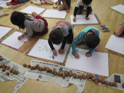 たくさん収穫した子どもたちは,収穫した様子を絵にかきました。手を伸ばしてキウイを採る様子やたくさん並んでいるキウイ,友達と一緒に応援しあったりしている姿をかいていましたよ。