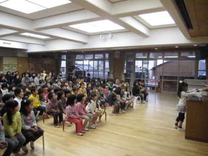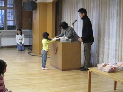 3学期の終業式でした。たんぽぽ・ひまわり・もも・ちゅうりっぷ、それぞれの名札ですごす最後の日です。進級祝い品を一人ずつもらいました。両方ともお弁当包みです。くくったり、結んだりできるように学年に応じて選びました。一つ大きい学年になったら使ってほしいと願っています。一人ずつもらいにくる姿は、もう年中、年長のように立派でした。きっといいお兄さんお姉さんになってくれることでしょう。とても嬉しく思いました。みなさんありがとうございました。