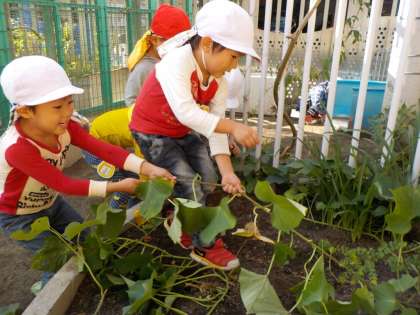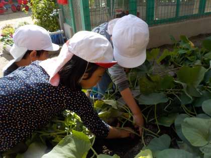 園庭の畑でサツマイモ掘りをしました(4歳児)