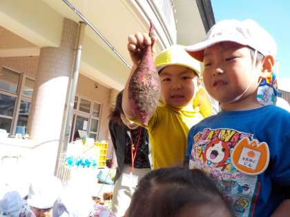 つるをもって「よいしょ、よいしょ」ひっぱると,ながーいつるの先に,まん丸のサツマイモが土の中から出てきました。「おいもだー」「すごいおっきい!」と,子どもたちは大興奮。どんどん掘っていくと,大きいお芋,小さいお芋,まるいお芋や,細いお芋,色々な形のサツマイモがたくさん掘れました。