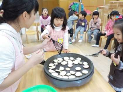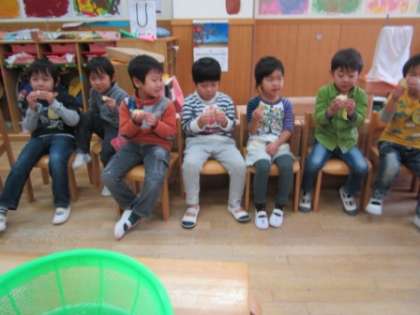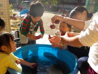 朝から4歳児がごしごしお芋を洗いました。長いのや丸いの…「どれにしようかな」と楽しんで選んでいる子もいました。切ったものをホットプレートに並べて,歌ったり,「焼けないかな」「いいにおいがしてきたね」と話したりしながら焼けるのを待ちました。