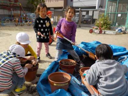 先日,4歳児の保育室前の畑でたくさんのお芋を収穫しました。シャベルをつかってその土をみんなで「よいしょ,よいしょ」と耕し,今度は大根を植えました。プランタには玉ねぎを植えました。
