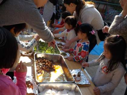 親子で記念事業も楽しみました。Tシャツづくりでは,絞り染めをしました。輪ゴムで縛って模様をつくり,赤・オレンジ・青の染料にTシャツをつけて水洗いをし,みんなの思い思いのTシャツができました。ピザ作りでは,生地を伸ばし,カブやローズマリーなどいろいろな材料をのせて,園庭の窯で焼き上げました。アツアツのできたてのピザを,おいしくいただきました。お茶会では,サツマイモの茶巾絞りとおいしいお茶をいただき,みんなほっこりしている様子でした。