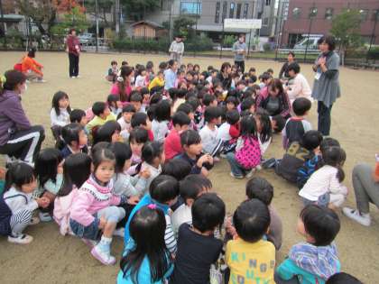 もし地震があったときは,自分の身をどのように守るべきかみんなで話し合ったり,先生に教えてもらったりしながら,子どもたちは訓練に備えました。緊急放送で教頭先生から「地震です。机の下などに避難しましょう」と指示があると,一斉に机の下にもぐりこみ体を丸くして頭を手で押さえて揺れが静まるのを待ちました。そのあとは,竹間公園まで歩いて避難をして保護者の方が迎えに来るのを静かに待ちました。