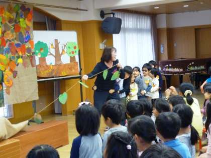 みんなでお祝いの歌を歌った後は,「大きなかぶ」ならぬ「大きないも」のお話が始まりました。11月の誕生児や教頭先生が一緒にひっぱってもなかなかぬけない大きないも。最後に登場したのは,幼稚園で一番頼りになる園長先生です。園長先生が加わってひっぱると・・・やっと大きな大きなおいもがぬけました。