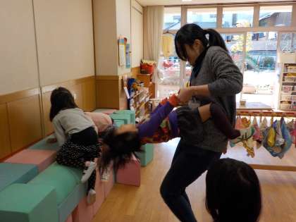 「私の名前知っている?」「一緒に遊ぼう!!」子どもたちからの誘いに緊張されていた学生さんたちも自然と笑顔になり,子どもたちのパワーに引っぱられて,短い時間でしたが,すっかり仲良しになりました。