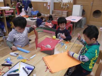 4歳児は画用紙を半分に折り,穴あけパンチで穴をあけたところを毛糸でかがり,カバンをつくっています。毛糸でかがるのはなかなか大変なのですが,子どもたちはとても器用にかがっています。たくさん穴を空けたり,毛糸の色を左右で変えてみたり,色々なかがり方を試してみたりと一人一人の工夫や思いのこもったかわいいカバンが保育室に並んできています。