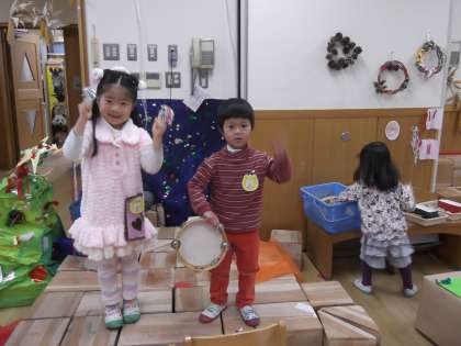 また,たんぽぽ組とひまわり組の間にステージが出来て,音楽に合わせて子どもたちがいろいろな楽器を鳴らして,音楽会も始まっています。