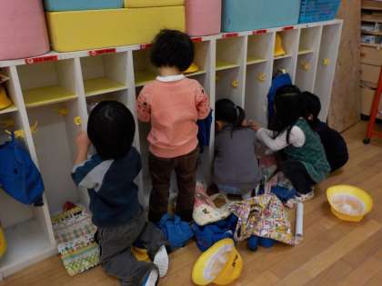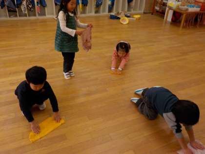 大掃除をしている年少組では,ぞうきんを上手につかって床をぴかぴかに磨いていました。保育室にあるおもちゃや自分たちの荷物も新しい年を迎えるまでちょっとお休みです。自分のロッカーをきれいにして,道具を一つにまとめて片づけました。大掃除ってみんなでやるとすっきり気持ちよくて楽しい気分になりますね。