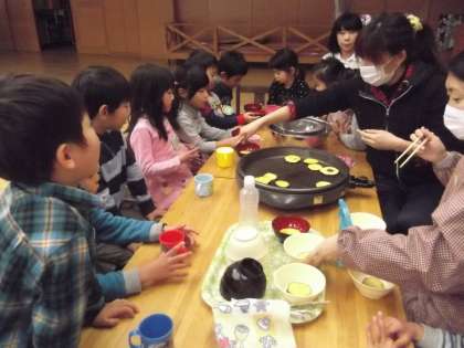 少し早めに片づけて今日のお楽しみは,ホットプレートでの焼き芋でした。お芋が焼けるにつれてとてもいい匂いが充満するので「早く食べたい!」と待ちきれない様子で楽しみに待っていました。
