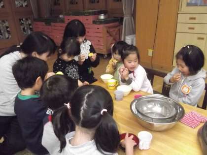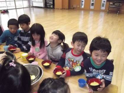 美味しそうに焼けたお芋を器に入れてもらって「いただきます!」焼きたてのお芋はアツアツでしたがとってもおいしかったようです。美味しくて,楽しい預かり保育でした。
