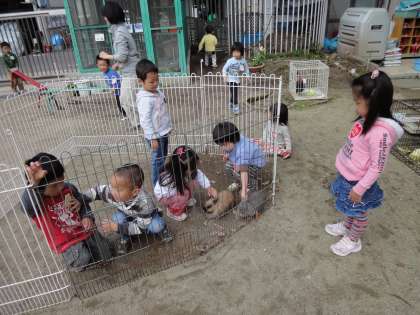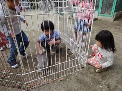 ウサギのふうちゃんとららななちゃんを,園庭の飼育小屋の前にゲージを作って放しています。「入りたい」と年長児や年中児の姿を見てすぐに中に入っていく子どももいれば,「こわい」と外から見ているだけの子どももいます。