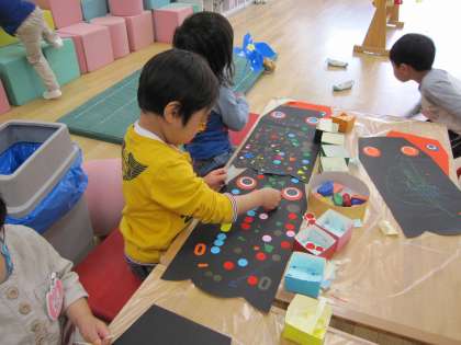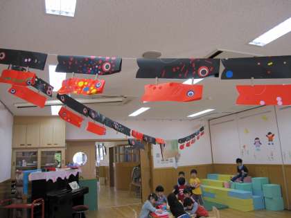 先生が準備してくれた通りにしていくと自分のこいのぼりができていく3歳児さん。赤と黒の紙にクレヨンでかいたりシールを貼ったりしています。「せえへん」「いらん」「もっとしたい」「先生一緒にして」・・・取組への参加はいろいろですが、持ち帰りの日にはみんなのこいのぼりが出来ていることでしょう。幼稚園での初めての製作品?です。きっと嬉しいでしょう。子どもの作品は、出来上がりの善し悪しを大人の基準で計るのではなく、オリジナルであることを褒め、自分のが作れたことを認め、一緒に喜んで見てもらいたいと思います。