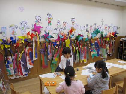 風車も鯉も吹流しもみんなお手製、一人ひとりの大きいオリジナルこいのぼりができました。「年長さんになったらあんなん作りたいなあ」と憧れていた鯉のぼりです。難しいことろがいっぱいあっただけに、やり遂げた満足や喜びが大きいことでしょう。持ち帰っていつまでも大切にしてほしいと思います。やったね!年長さん。しっかり自信も培われたことでしょう。