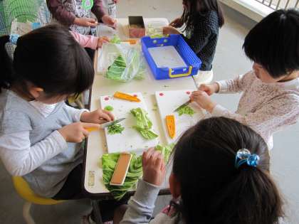 2階のテラスでは飼育している生き物たちのごはん?づくりが盛んです。お当番の子どもを中心にパンやキャベツなどを包丁で細かく切っています。進級したての頃は危なっかしい手つきだったのが、だいぶんうまく使えるようになってきました。幼稚園には給食はありませんが、栽培している野菜を使ってみんなで同じものを食べる機会があります。そんな時に年長さんの出番が来ます。普段から少しずつ包丁に慣れていることがきっと役に立つことでしょう。お当番さん、今日もよろしゅうおたのもうします。