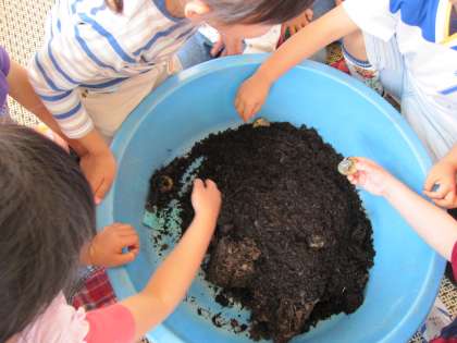 たくさん食べていっぱい糞をします。飼育ケースからたらいに空けて大掃除です。この飼育用のマットは腐葉土と一緒にして畑になります。新しいマットと入れ替えてまたしばらくは幼虫には会えなくなります。「なんで暗いとこが好きなん?」と聞かれて「なんでやろう」と一緒に考えてみました。不思議がいっぱいの子どもたちです。