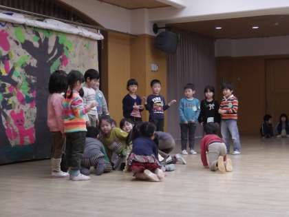 転がってきたおむすびを見つけて食べるねずみさん。“おむすびころりんすっとんとん”の掛け声もとてもいい声で気持ちよく揃っていました。おむすびがなくなったので次はおじさんやおばあさんが転がって穴に入っていったのもとても可愛かったですね。そして,一緒にもちつきをする様子はとても楽しそうでした。自分たちの役割を楽しんで,そしてみんなで声をそろえたり,一緒に踊ったりする楽しさを感じていたように思いました。