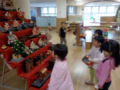 5歳児はすみれ組の前に飾ってある雛人形を見ながらお弁当を食べました。