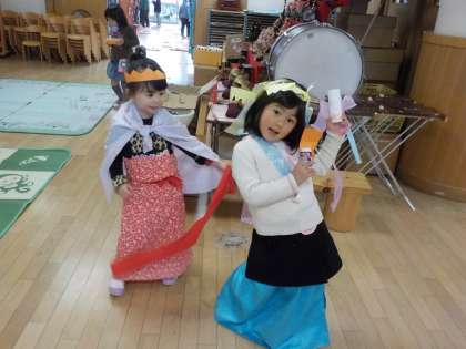 3歳児はお雛様,お内裏様に憧れて,同じようにきれいな布をまとって雛祭りごっこをしています。冠や飾りも自分達で見よう見まねでつくり,すっかりなりきって遊んでいます。