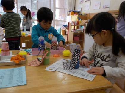 4歳児はひな人形をつくりました。「長い髪をつけてあげる」「こんなお飾りだった」と思い思いに自分達の雛人形をつくっていました。