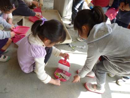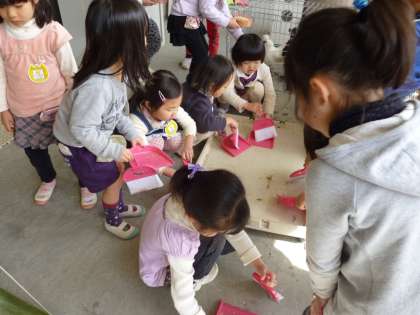 5歳児は4歳児の手を取って,道具の使い方を教えたり,餌や新聞を取り替える順番を伝えたりしていました。「最後までやり方見てたら,できるようになるからね。がんばってね」と4歳児を励ます5歳児の姿も見られ,いい引継ができました。