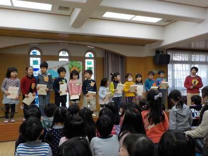 今年度の誕生会も最後になりました。待ちに待った3月生まれの子どもたち。みんなからお祝いしてもらい喜びいっぱいの笑顔でした。