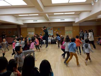全園児でオリジナル版「誕生月なかま」のダンスを楽しみました。♪○○ぐみのおともだち,みんな出てきておどりましょ〜 曲が流れると,スキップをしたり,まわってみたりしながらかわいいダンスを披露してくれました。ポーズも決まって,最後の誕生月にふさわしい賑やかな誕生会になりました。