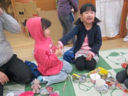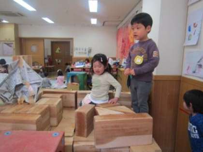 「ぼくたちも年中さんになったら,木の積み木で遊ぶの?」と,進級の楽しみがひとつ増えた3歳児。「もうすぐ大きい組になるんだ」という気持ちがますます高まった4歳児も。